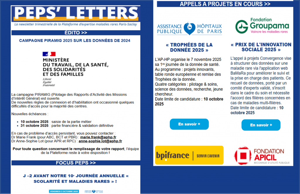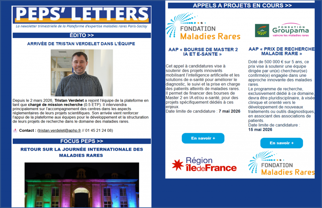 Abonnez vous pour recevoir chaque trimestre l’actualité de la plateforme d’expertise maladies rares Paris-Saclay avec des informations sur la recherche, les différents appels à projets, l’actualité des centres de référence maladies rares et plus encore.