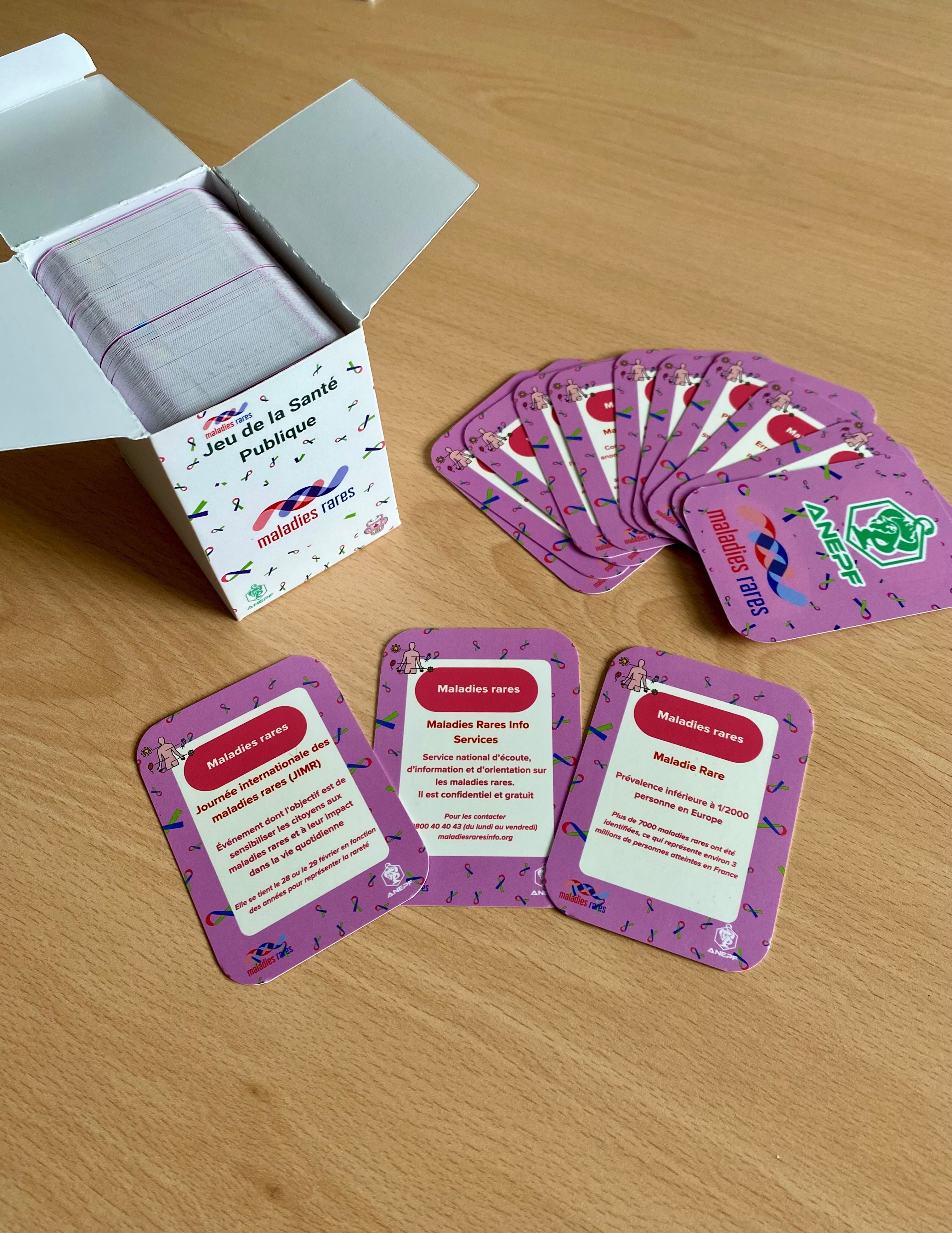 L’ANEPF (Association nationale des étudiants en pharmacie de France) a créé un jeu de cartes ludique, inspiré du Time’s Up, pour mieux faire connaître les enjeux de la santé publique. Ce jeu s’adresse aux étudiants et permet d’aborder ces sujets de manière interactive et conviviale. Parmi les cartes, 13 sont consacrées aux maladies rares. Leur conception a été menée en collaboration avec les membres du groupe de travail inter-PEMR/FSMR de l’AP-HP « Sensibilisation aux maladies rares via le secteur de la pharmacie » mentionné précédemment.